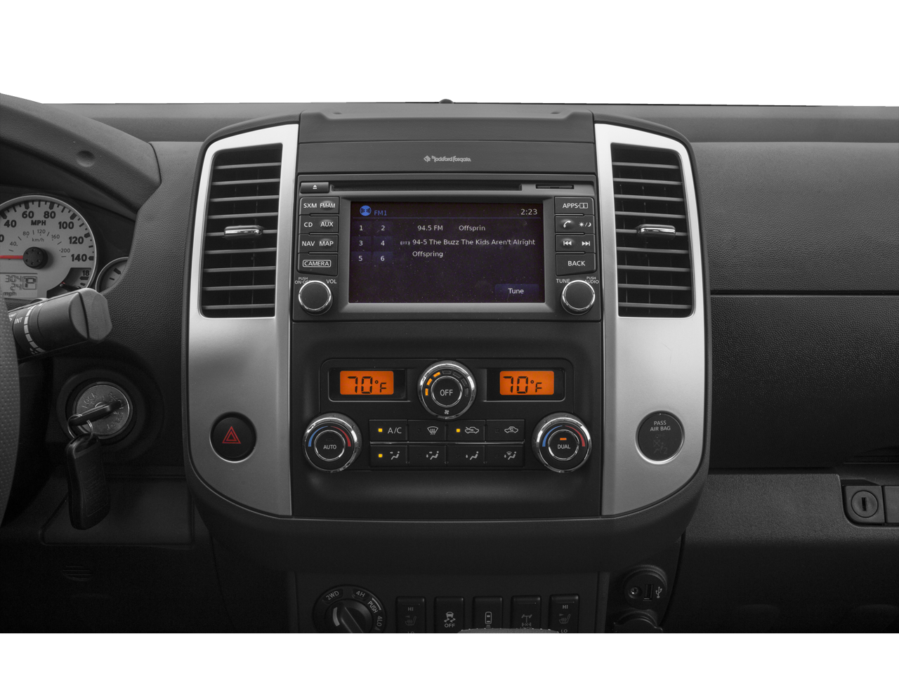 - Radio: Rockford Fosgate Premium Audio System -inc: AM/FM/CD/AUX, USB connection port, Bluetooth® hands-free phone system, streaming audio via Bluetooth®, Siri Eyes Free, steering wheel audio controls, 8 speakers w/1 subwoofer unit (2 speakers), NissanConnect w/navigation and mobile apps, Nissan Navigation System w/voice guidance, 5.8" color touch-screen display, Nissan voice recognition for navigation and audio, SiriusXM Traffic, SiriusXM Travel Link (fuel prices, weather, movie listings, stock info and sports) and SiriusXM satellite radio